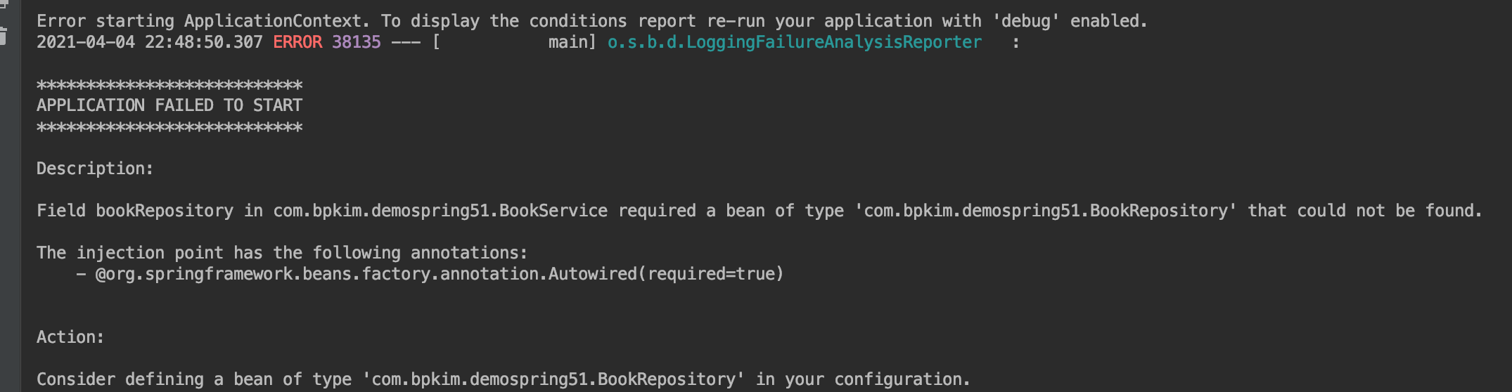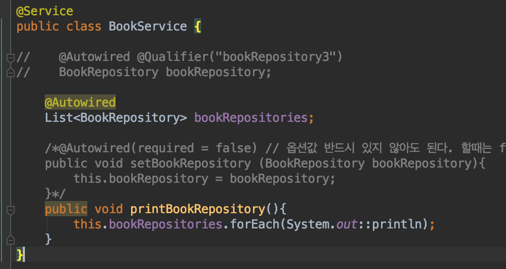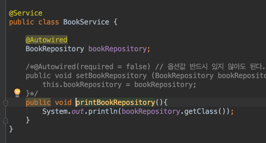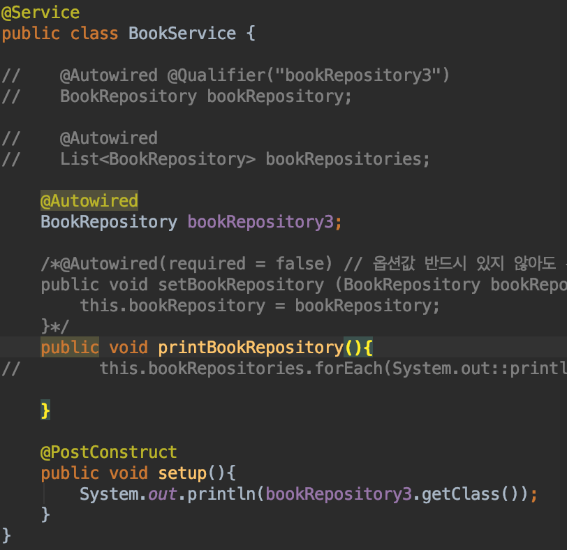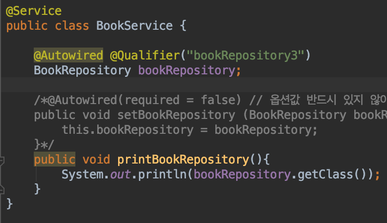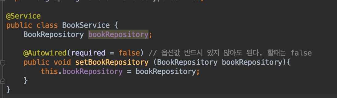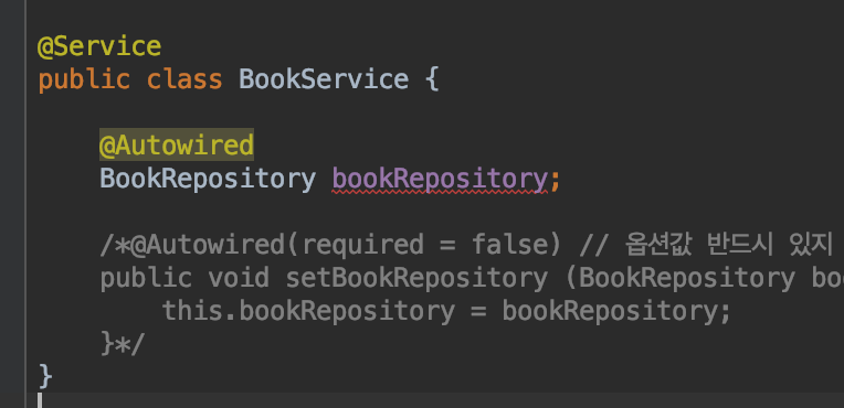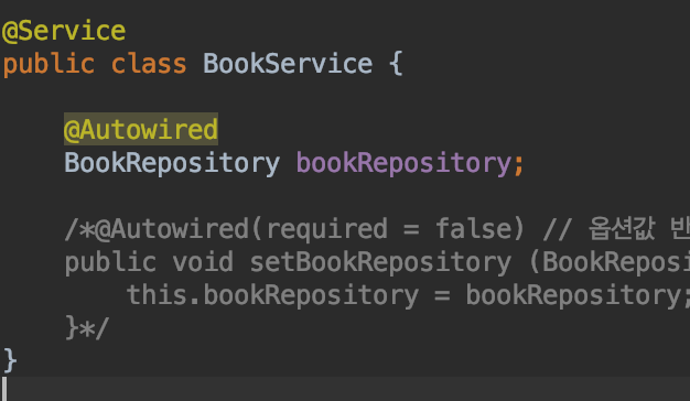 사용하던 BookRepository의 빈 설정을 해제 한후 해당 클래스를 의존성 주입을 해본다.