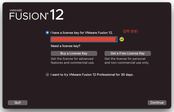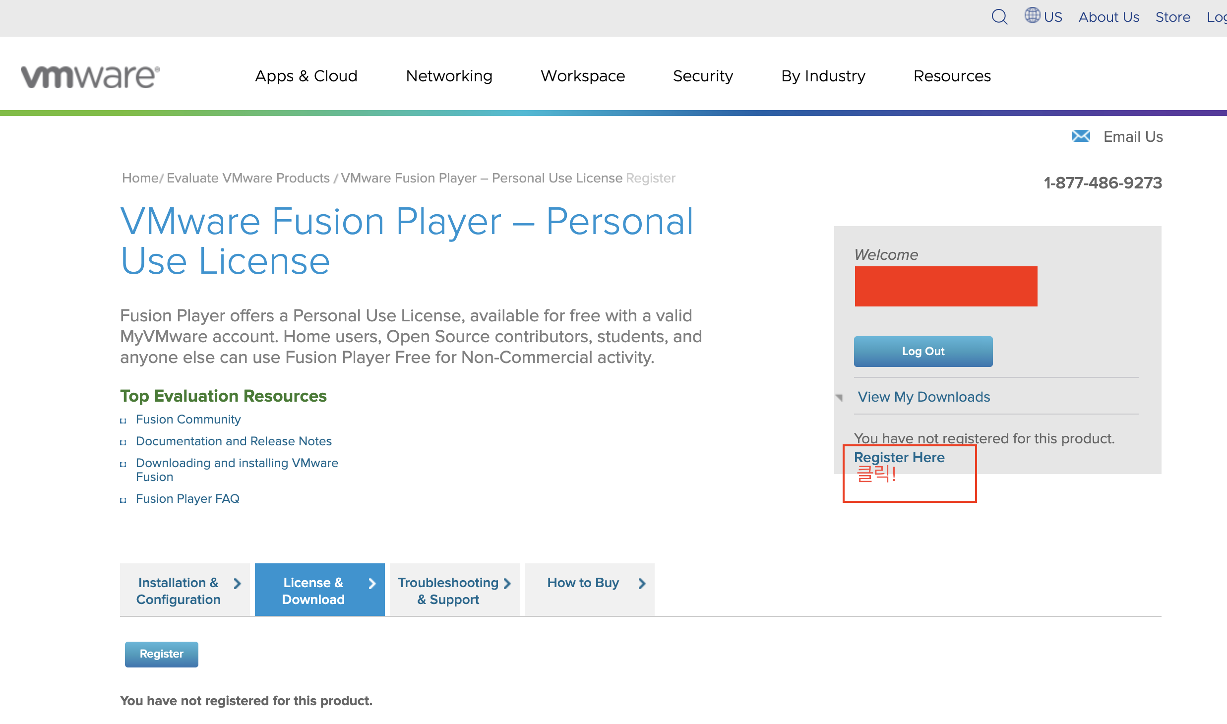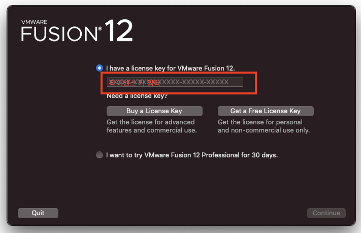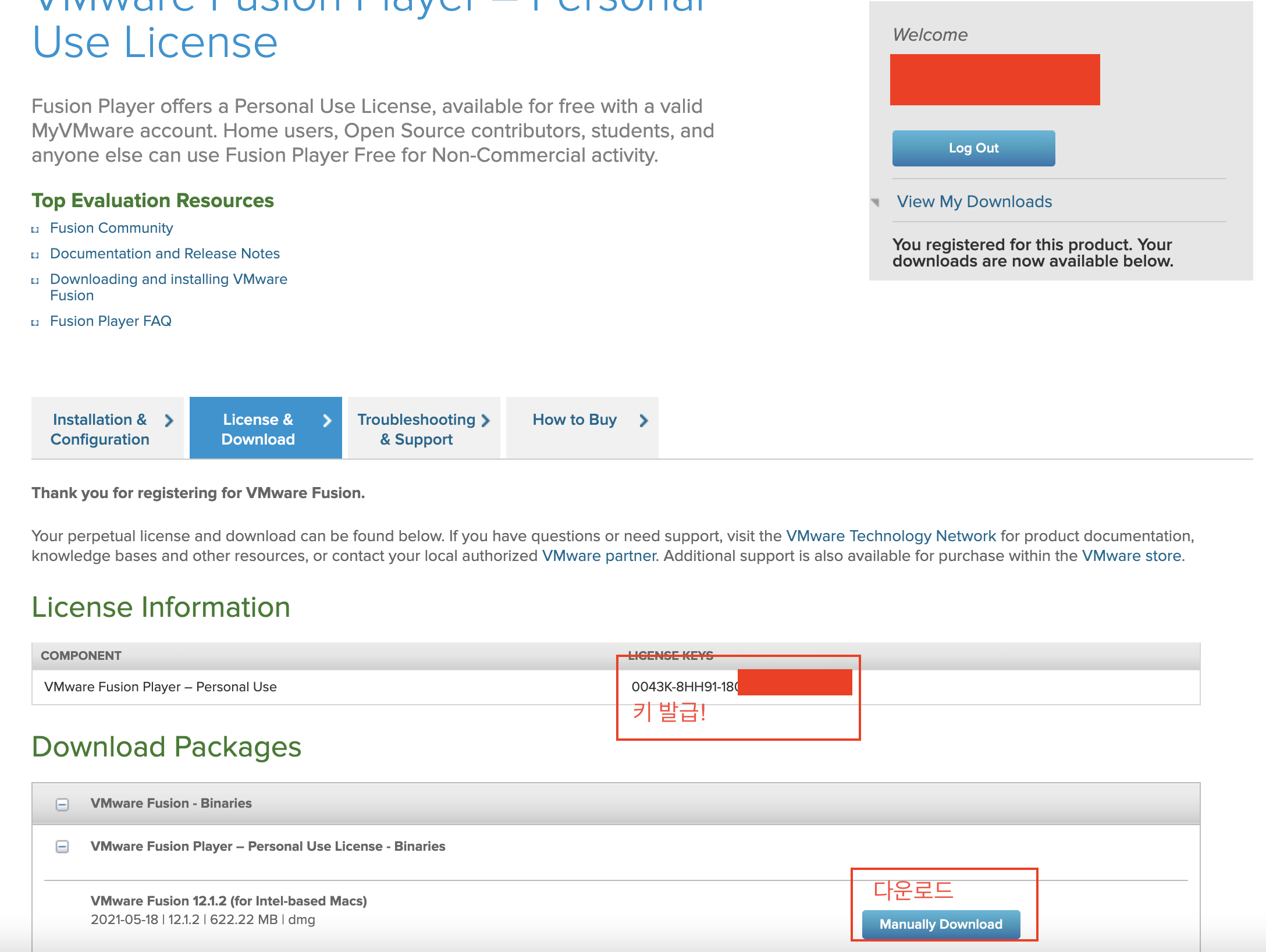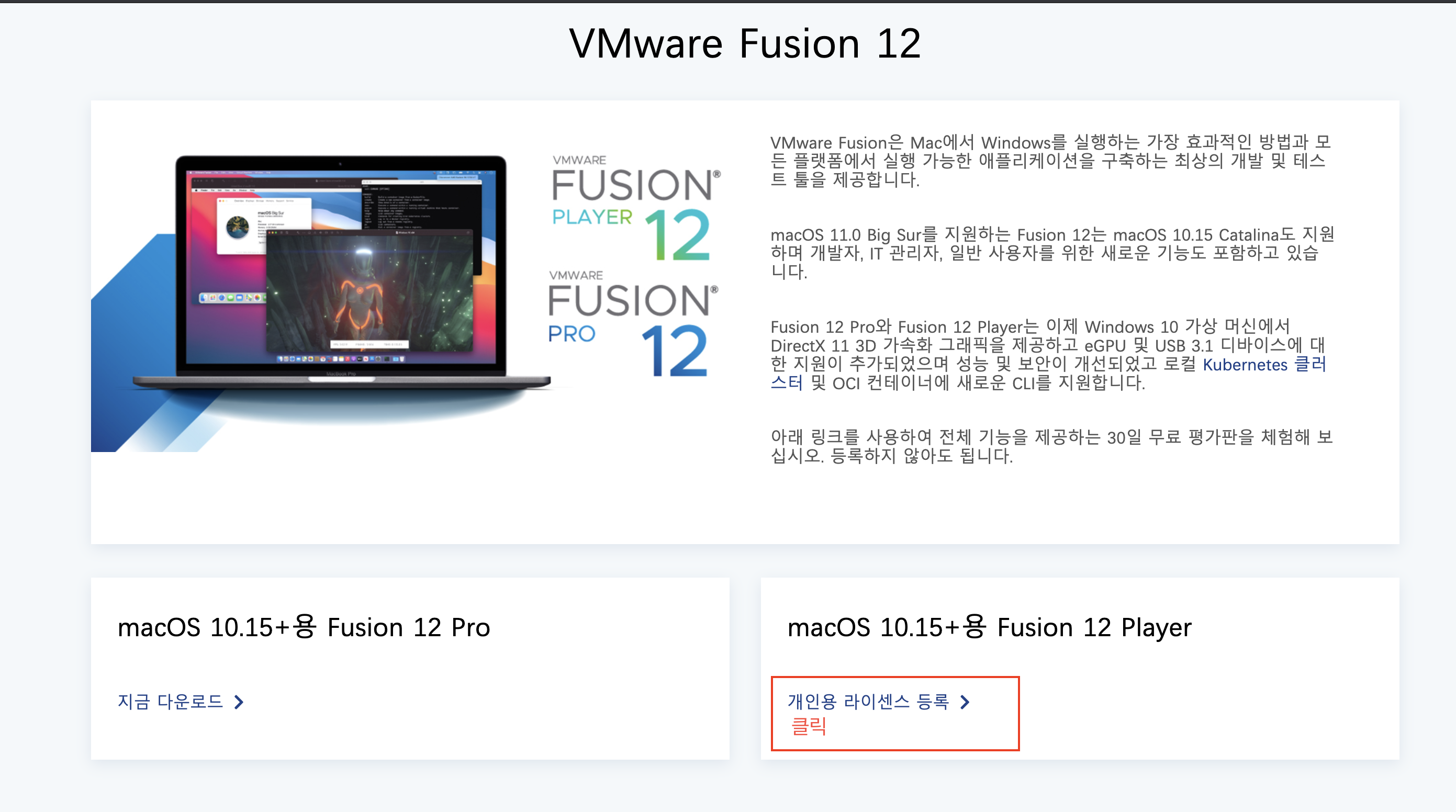 스크롤 아래로 내려오시면 macOS 10.15+용 Fusion 12 Player 아래 개인용 라이센스 등록 이 있어요! 여기를 클릭!