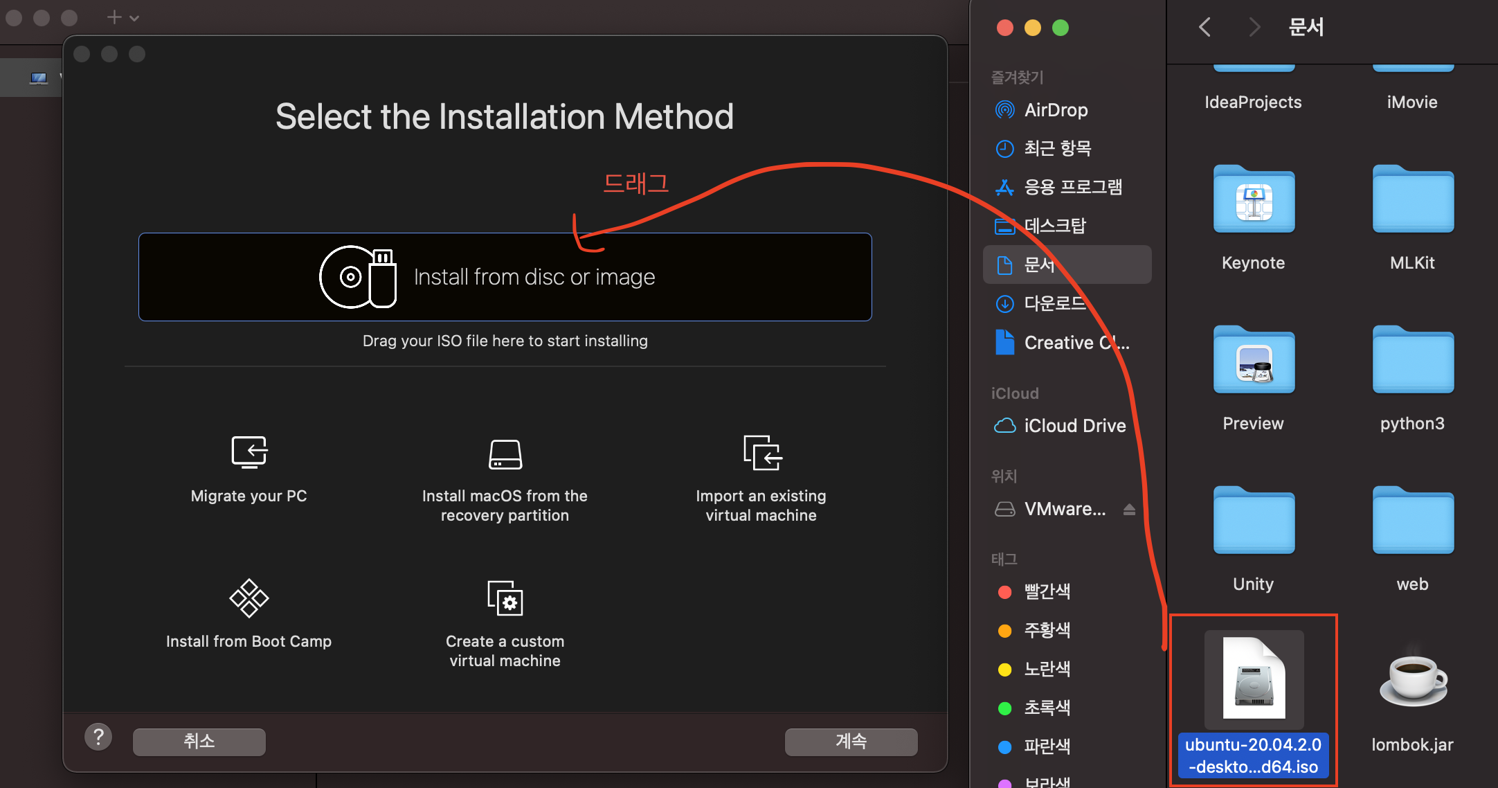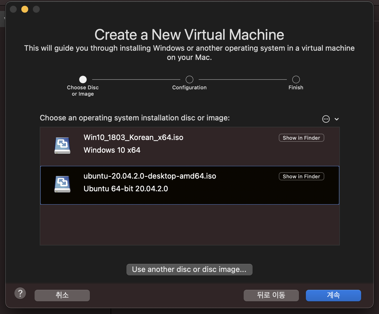 다운 받아 놓은 이미지 파일을 드래그해서 Install from disc or image 에 넣어주세요