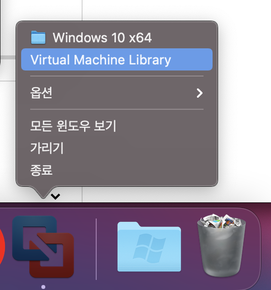 vmware를 켜시고 dock 에서 오른쪽 클릭하셔서 Virtual Machine Library로 이동 하세요