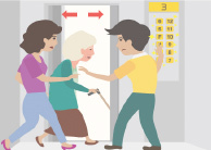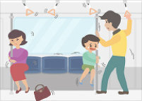 손잡이나 기둥을 잡아 넘어지지 않도록 합니다. 전철이 멈추면 안내에 따라 행동합니다.