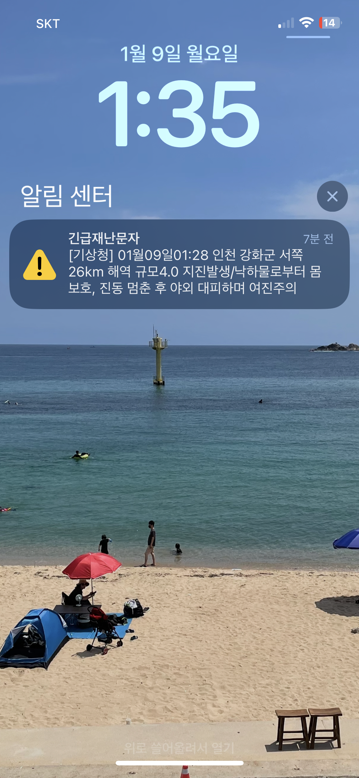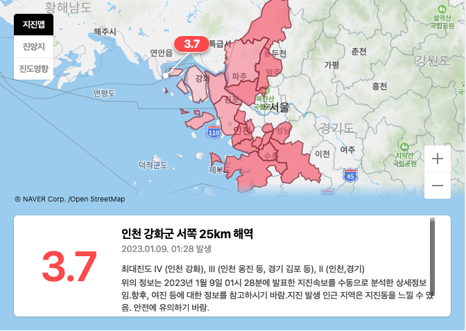 1월 9 일 오전 01:28인천 강화 서쪽 인근 26km 해역 규모 4.0 지진발생!