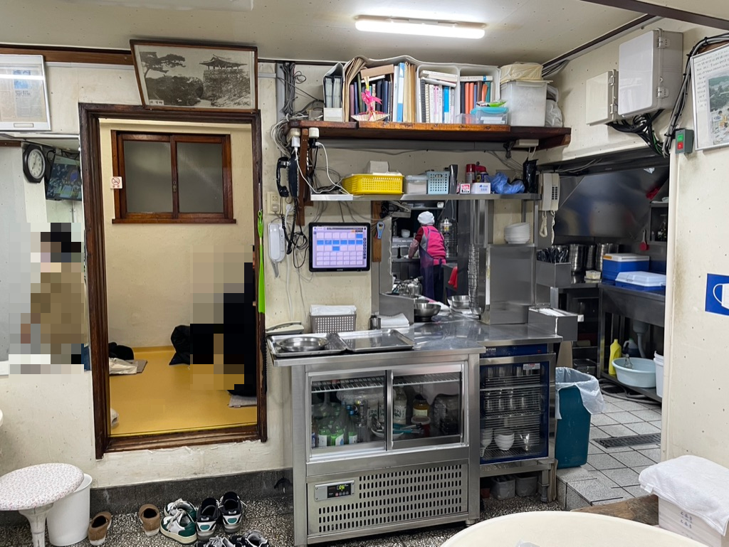식당에 처음 들어오시면 작은 방과 주방을 보실 수 있어요.