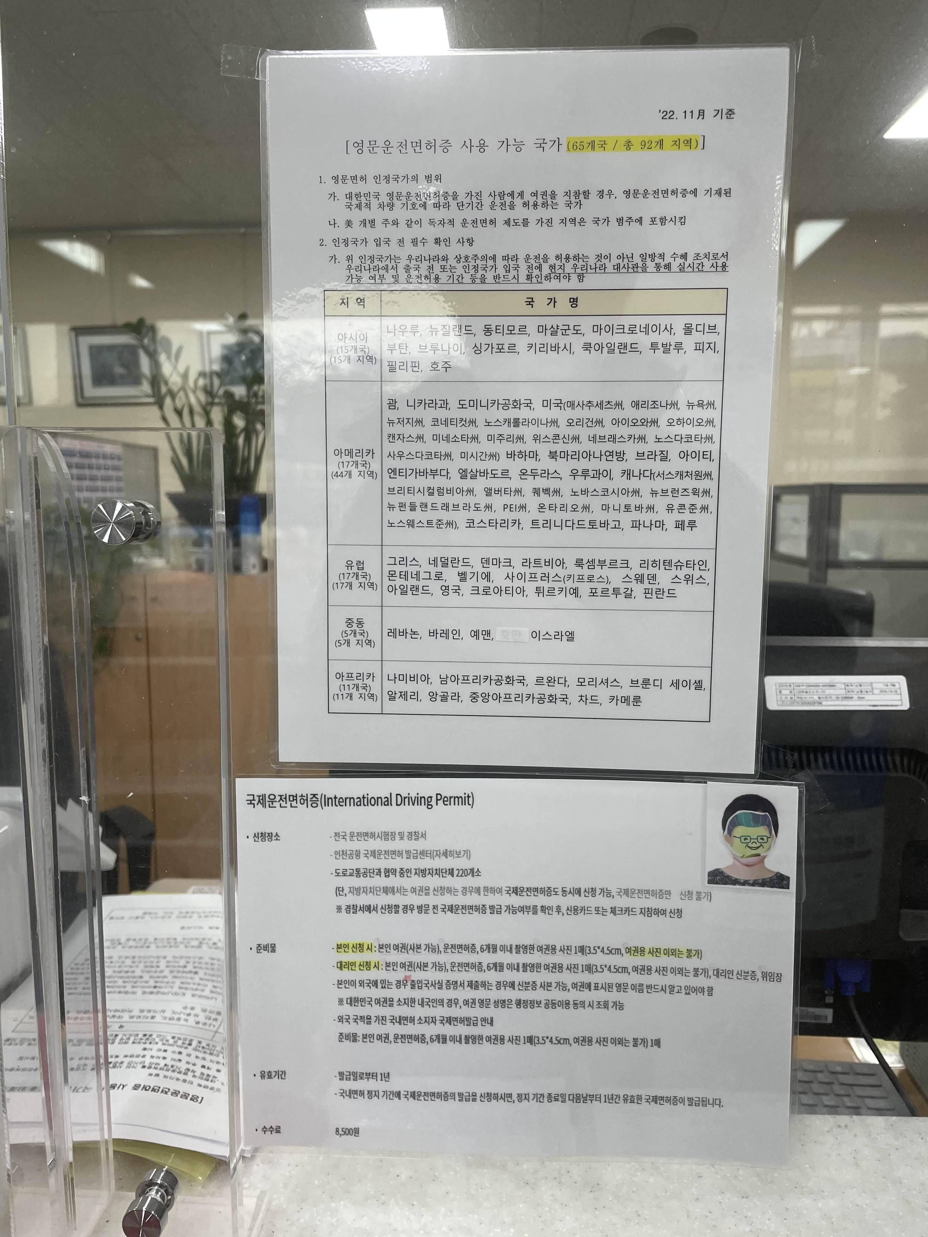 창구 앞에 국제면허증 신청서와 영문면허증 사용 가능국가가 표시되어 있네요.