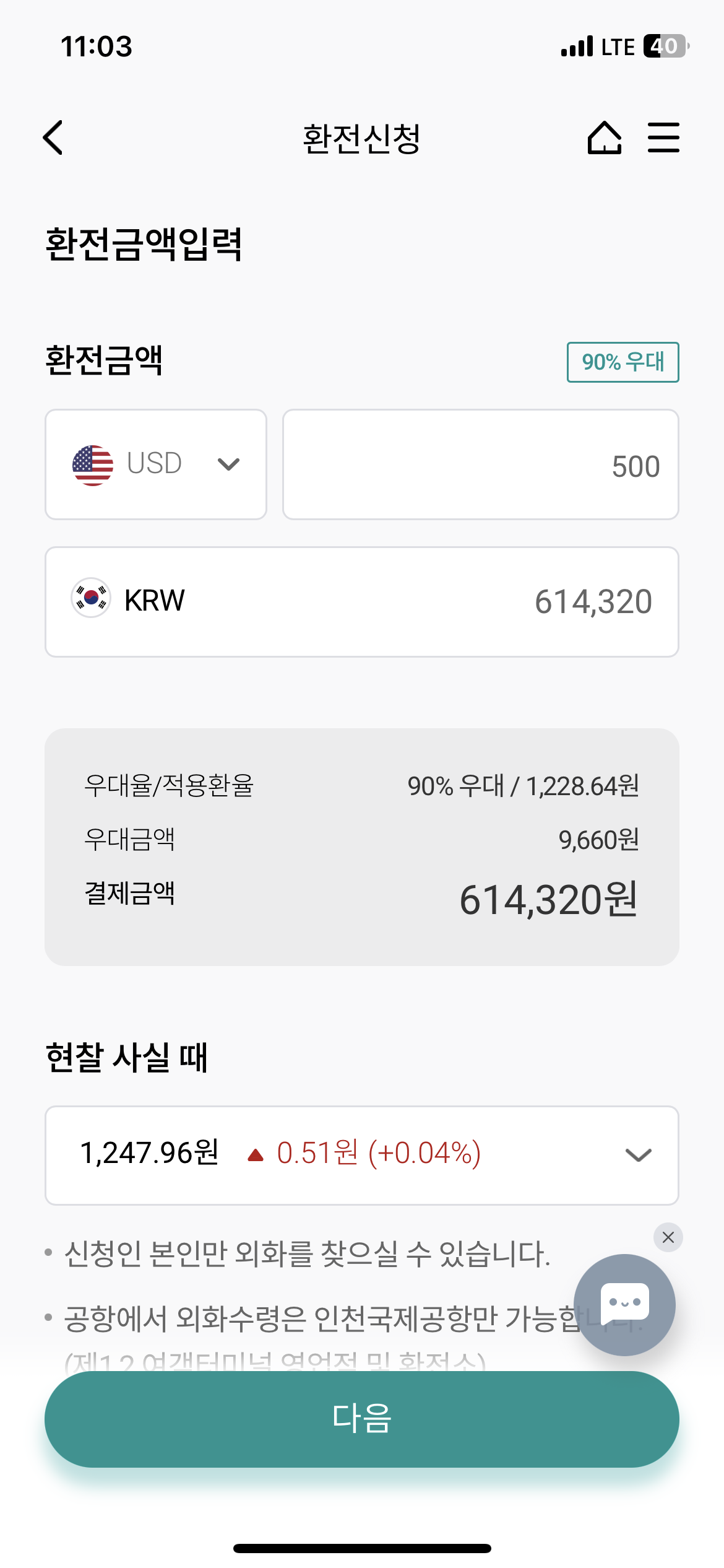 수수료율이 달라서 그런지 모두 환전 수수료 우대 90%를 받았는데 다 다르더라고요.