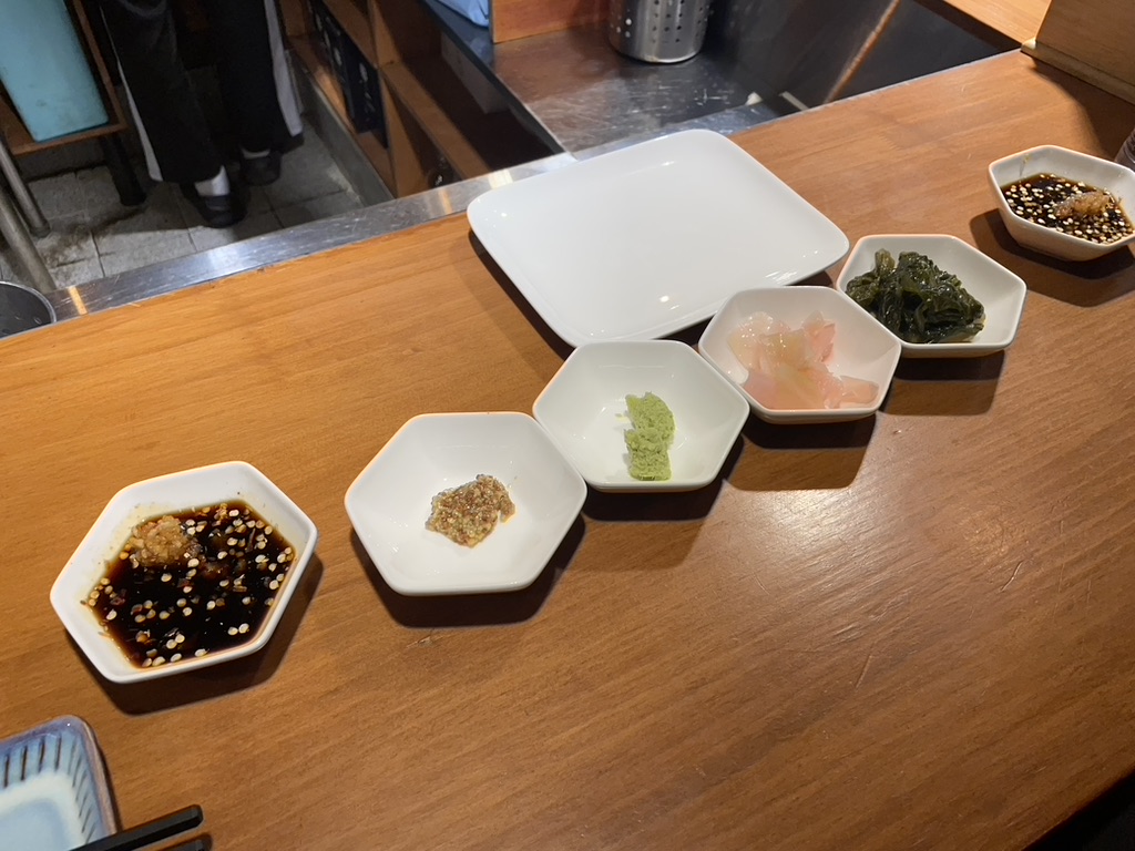 그리고 와사비와 고기와 같이 먹을 수 있는 밑반찬들이 나옵니다.