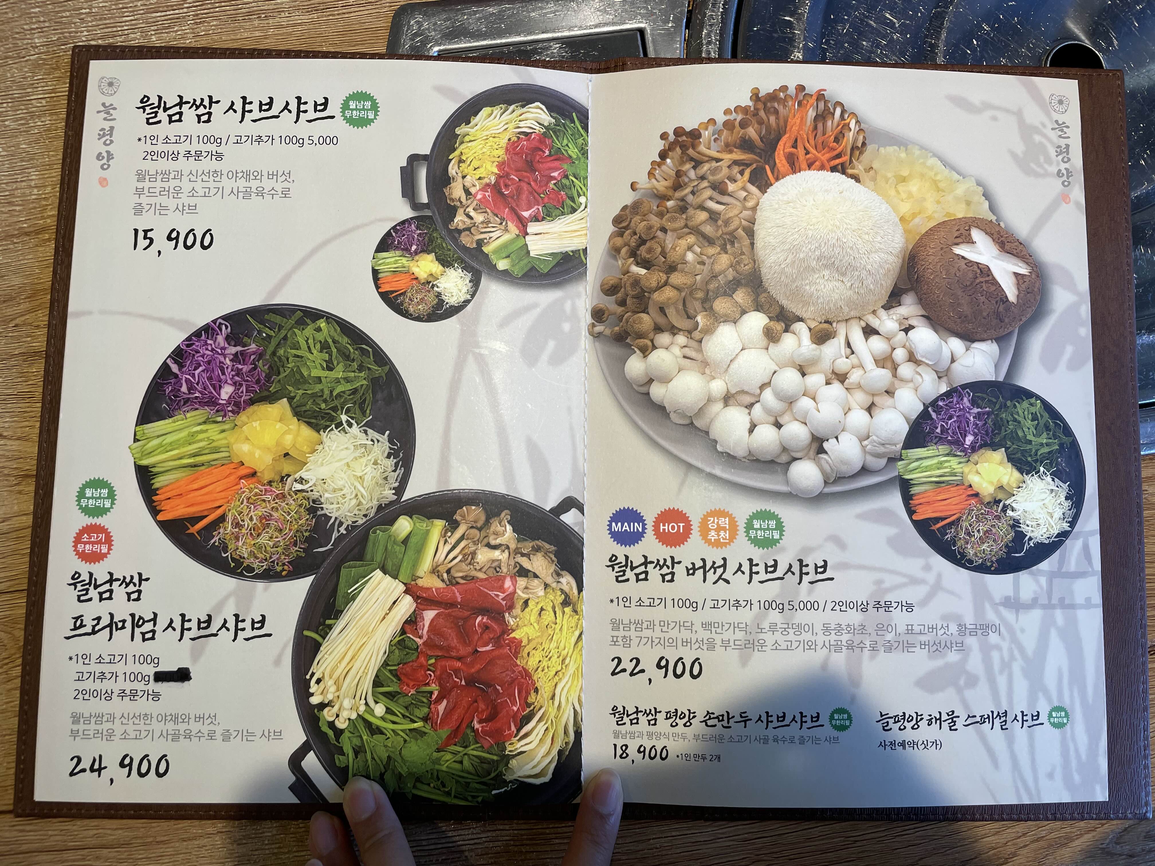 편의시설 : 단체석, 주차, 포장, 배달, 예약, 남/녀 화장실 구분대표메뉴 : 평양냉면, 버섯 샤브샤브, 프리미엄 얼큰샤브