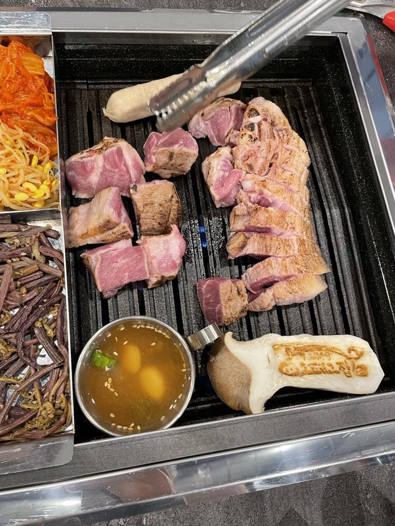 그리고 불판 위에 고사리와 김치, 콩나물이 나와요 ㅎㅎ 고기와 같이 먹기에 모두 맛있는 것들 뿐이네요