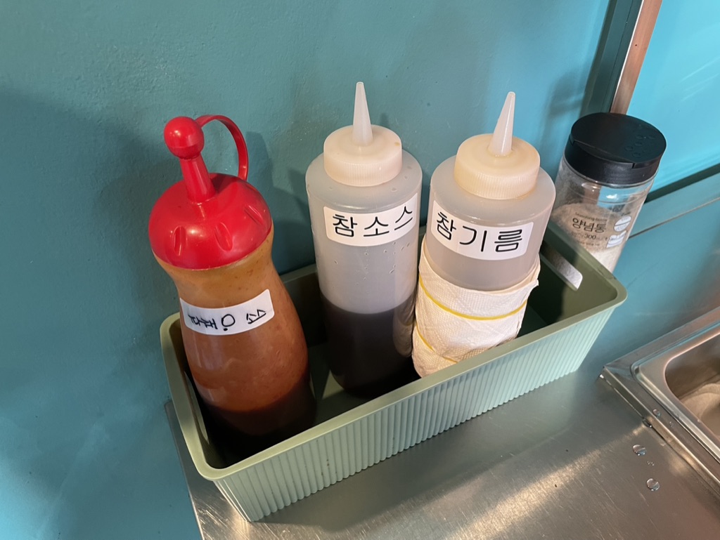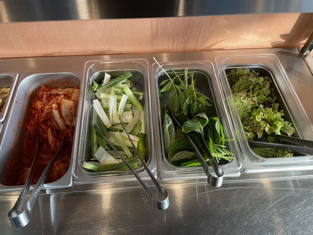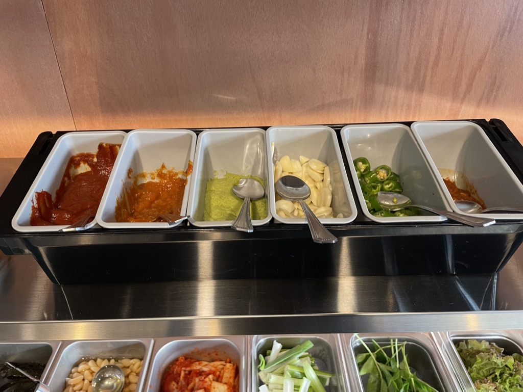 셀프바에는 소스류, 마늘, 파채, 쌈무 등 고기와 함께 먹을 다양한 것들이 준비되어있습니다.