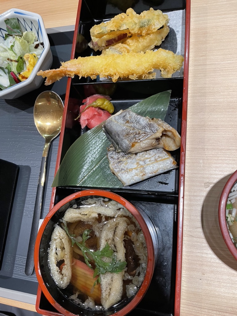 프리미어 벤토는 회, 스시, 튀김, 생선구이 우동국물로 구성되어 있었습니다.