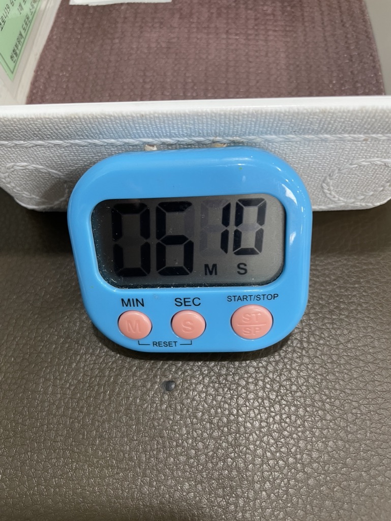 그리고 타이머를 달아주셔서 타이머가 끝날 때 주사 부분을 누르고 있는 저것을 떼주세요.