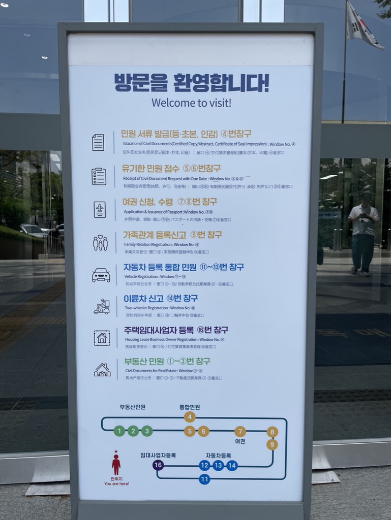 본관 앞에 가면 방문을 환영하는 표지판과 함께, 각 민원 별로 어디로 가야 할지 안내를 해주고 있습니다.