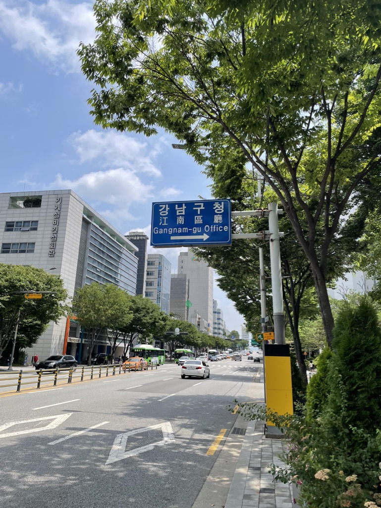 날씨가 화창한 여름날의 가로수와 강남구청표지판입니다. ㅎㅎ