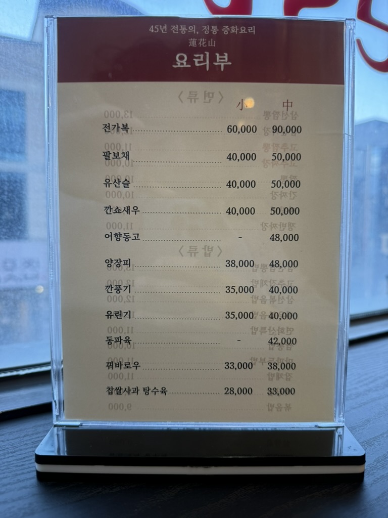 전가복, 팔보체, 유산슬, 깐쇼새우, 어향동고, 양장피, 깐풍기, 유린기, 동파육, 꿔바로우, 찹쌀사과 탕수육