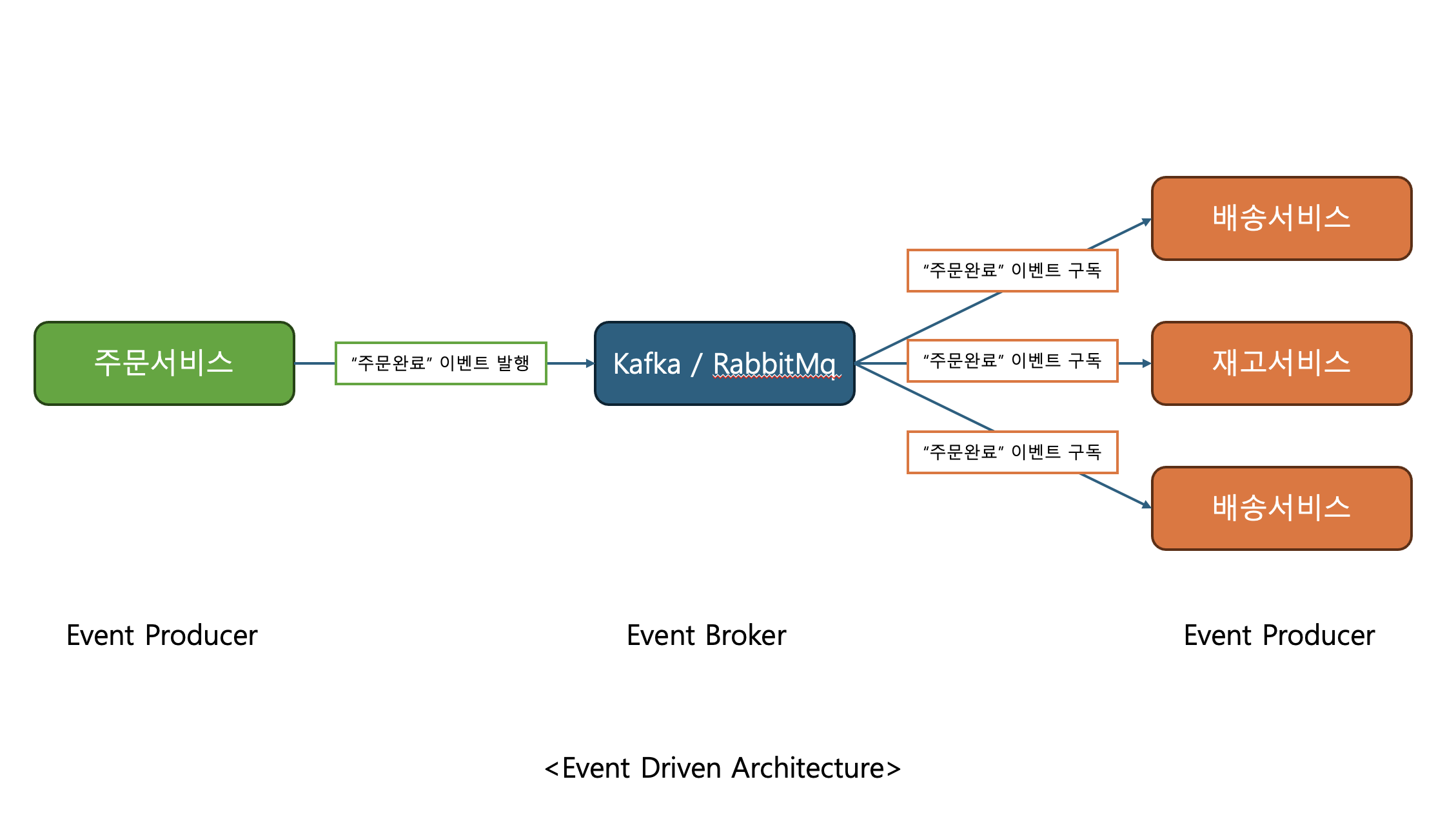 예) 주문완료시 "주문완료" 라는 이벤트를 발행 하여 이벤트 브로커에게 전달한다.