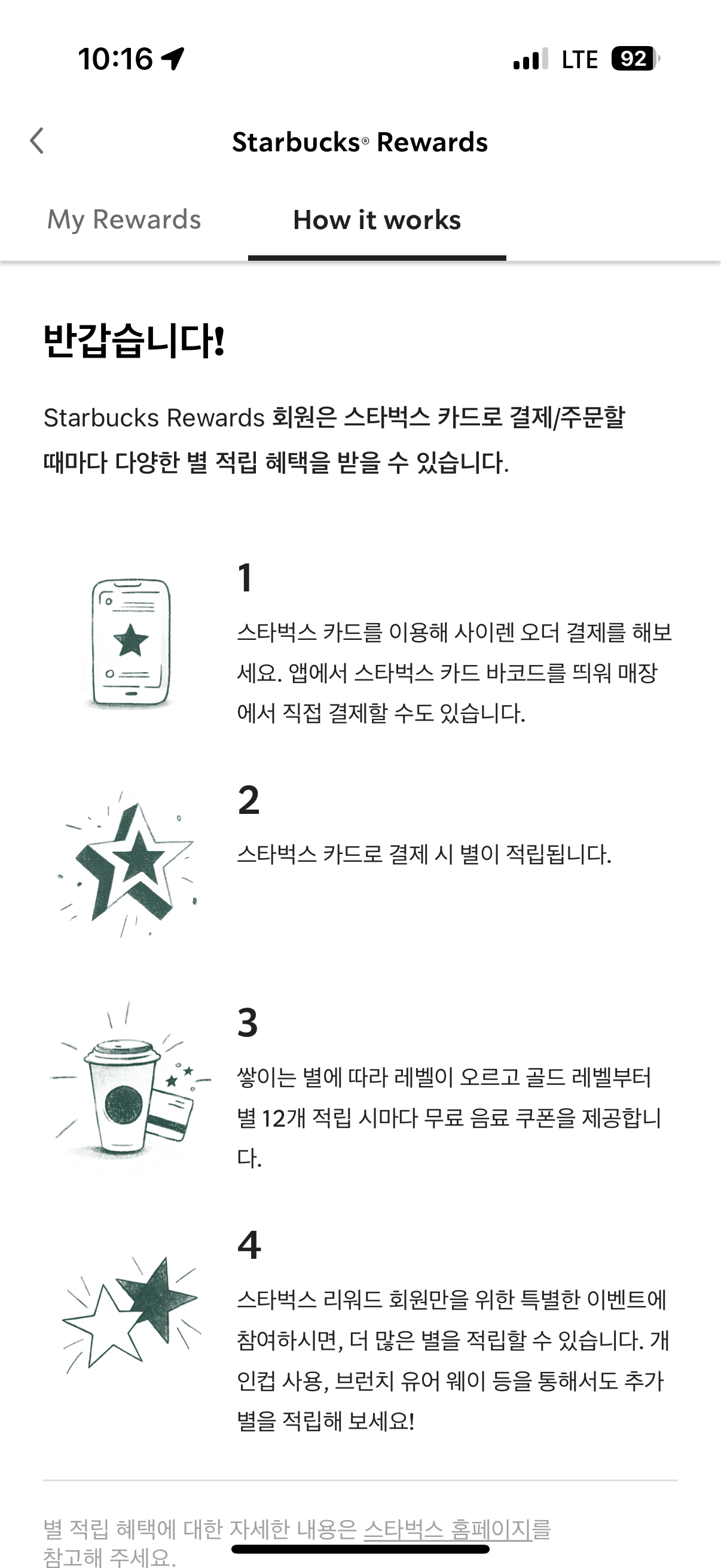 스타벅스 카드를 이용해 스타벅스에서 커피 구매할 시 1잔당 별 1개를 적립해줍니다.