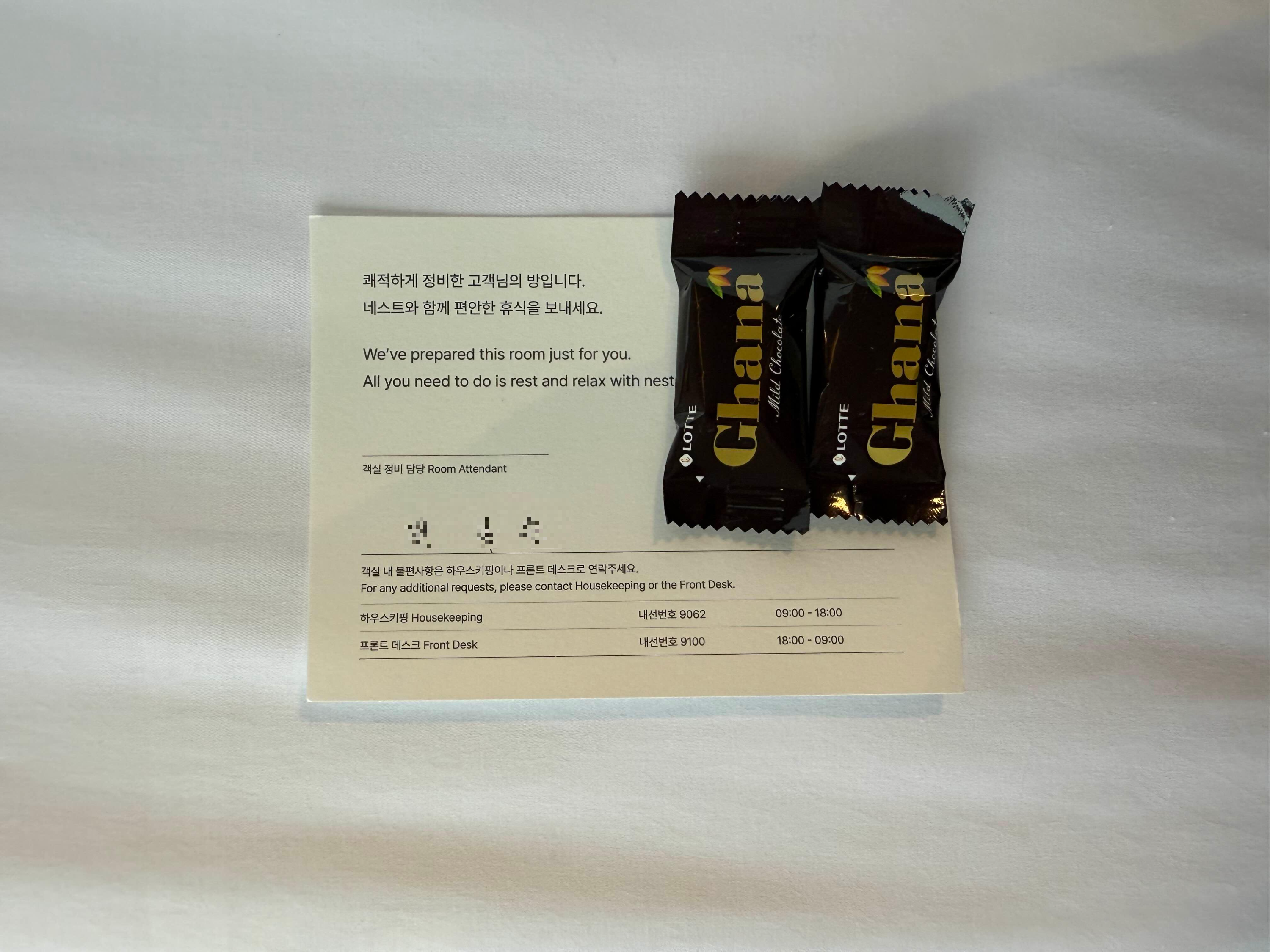 침대 한쪽에 요렇게 편안한 휴식을 하라는 메시지와 방 정리해주신 분 성함이 적혀있어요.