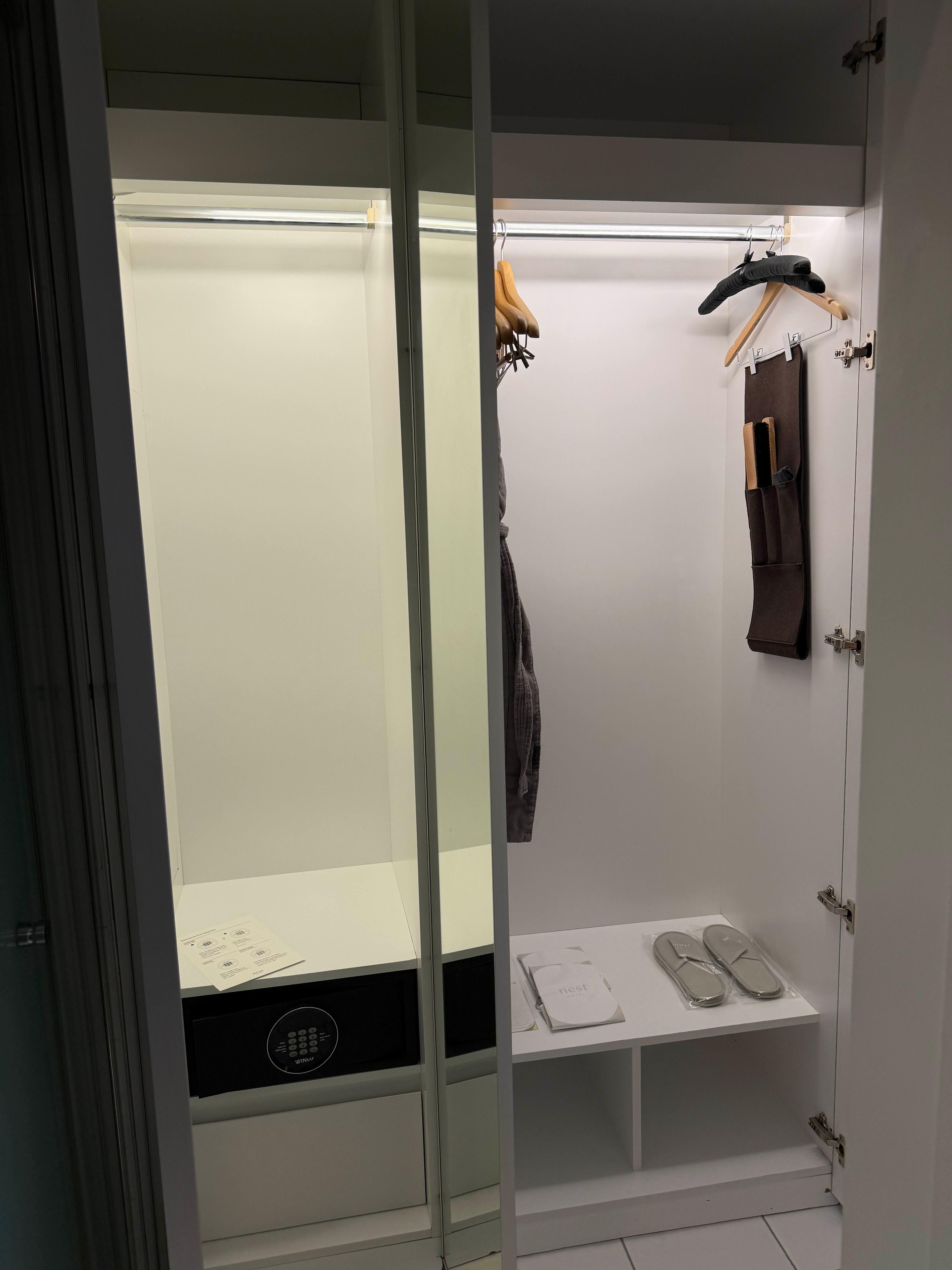 화장실 세면대 옆 에는 옷장이 있습니다.
