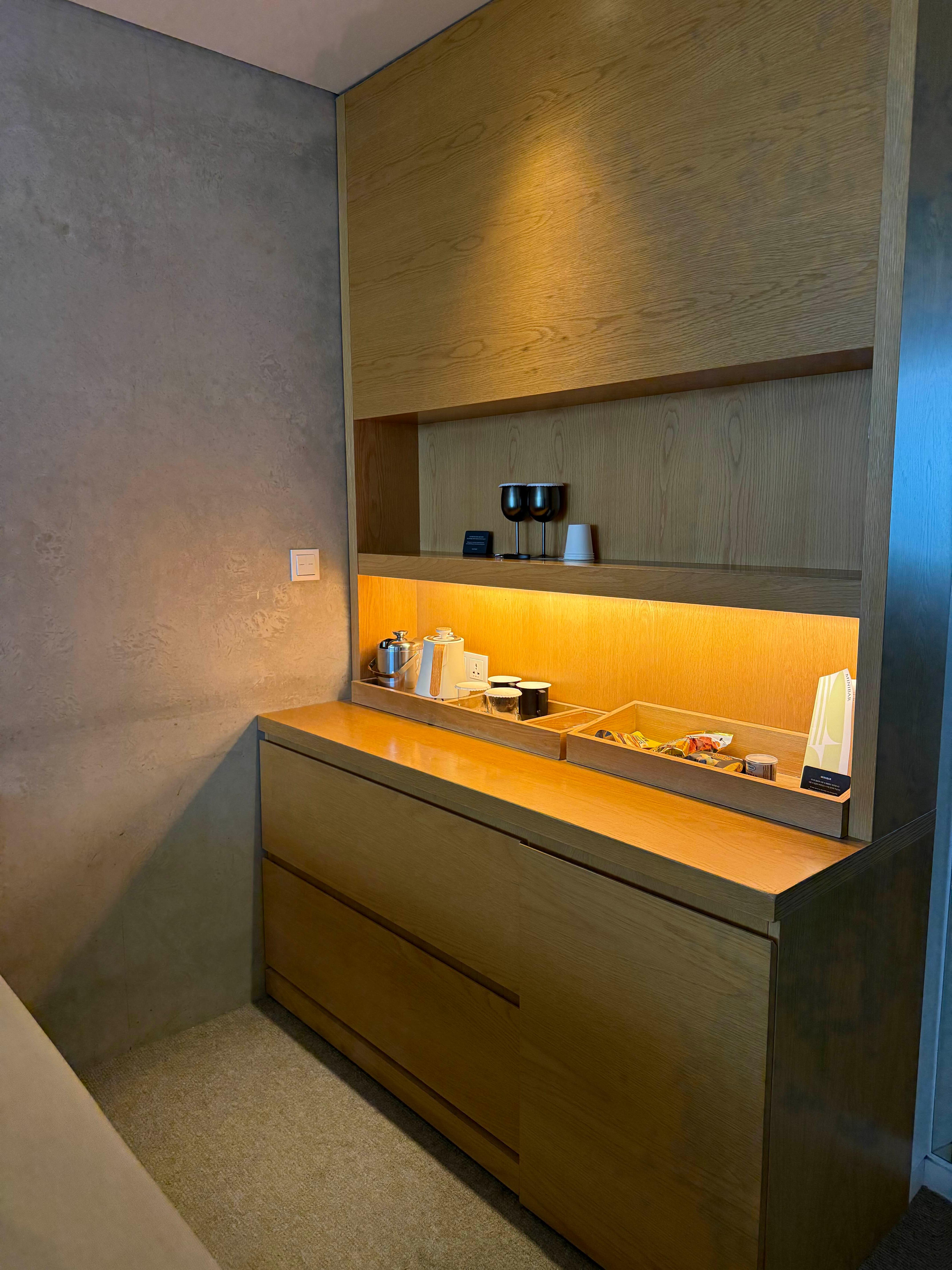 얼음통, 전기주전자, 컵, 작은 스낵들 그리고 커피, 티백들이 준비되어있어요.