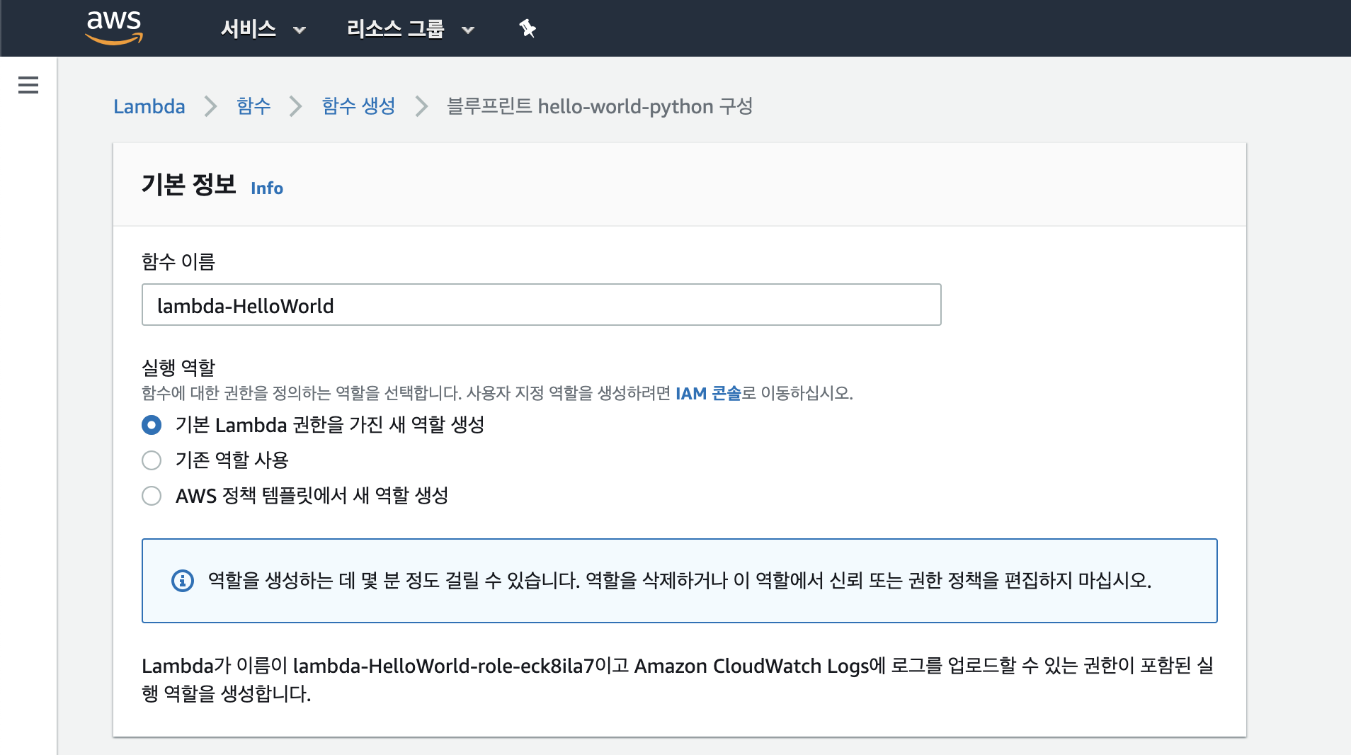 기본 정보: 이름: 여기에서 Lambda 함수의 이름을 지정할 수 있습니다. 본 자습서에서는 hello-world-python을 입력합니다. Role: 사용자 대신 Lambda 함수를 호출하기 위해 AWS Lambda가 맡을 수 있는 필요한 �