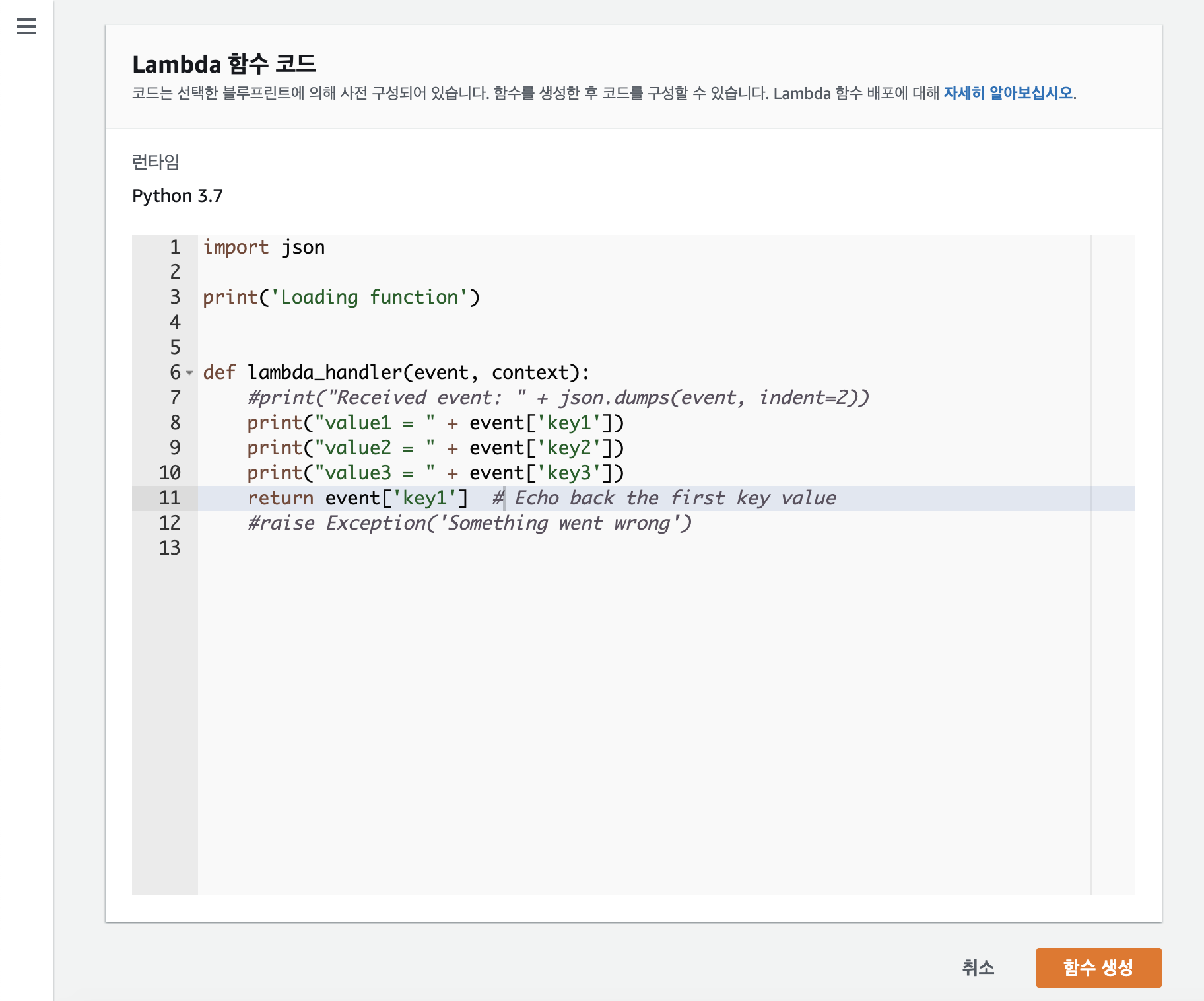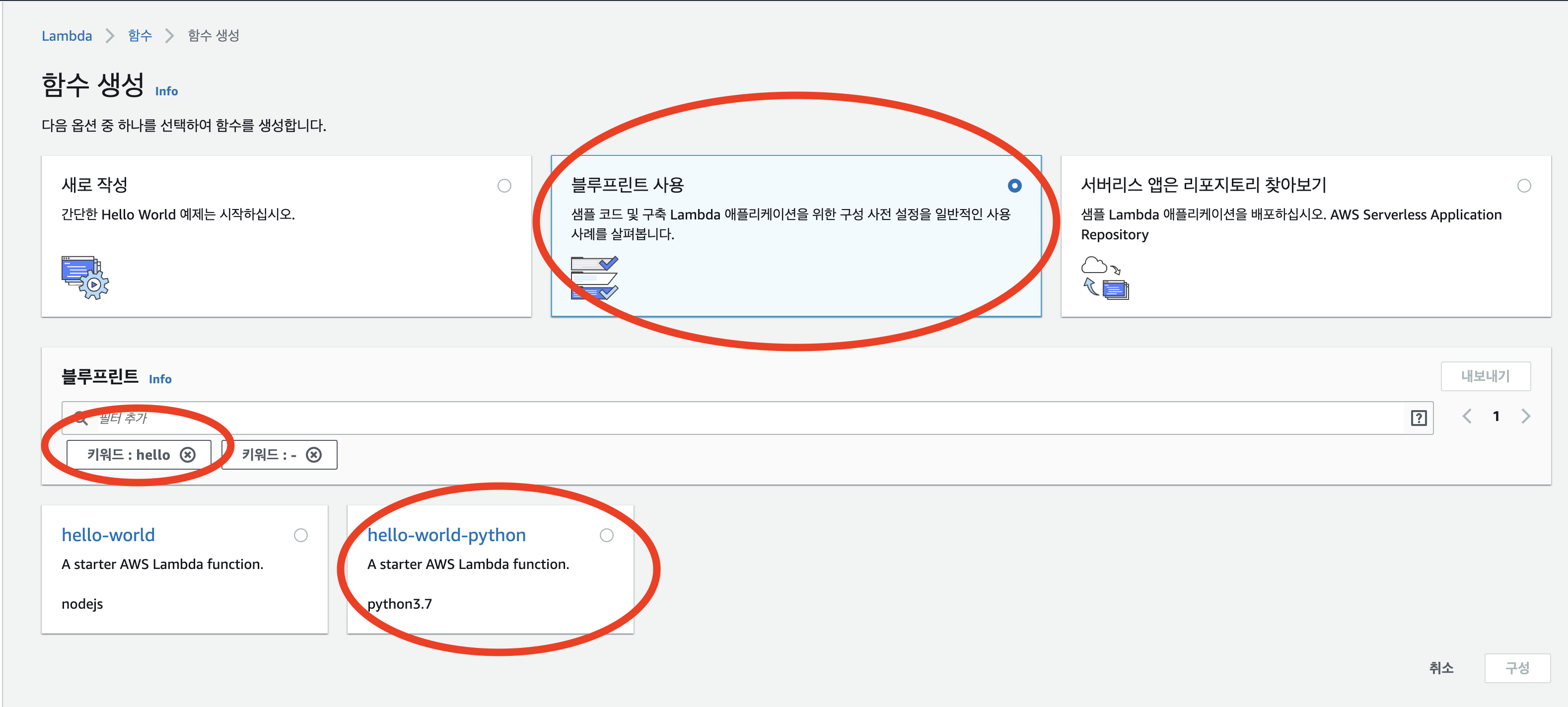 Lambda > 함수 생성 > Lambda Blueprint 선택 > HelloWorld 검색 > hello-world-python 선택