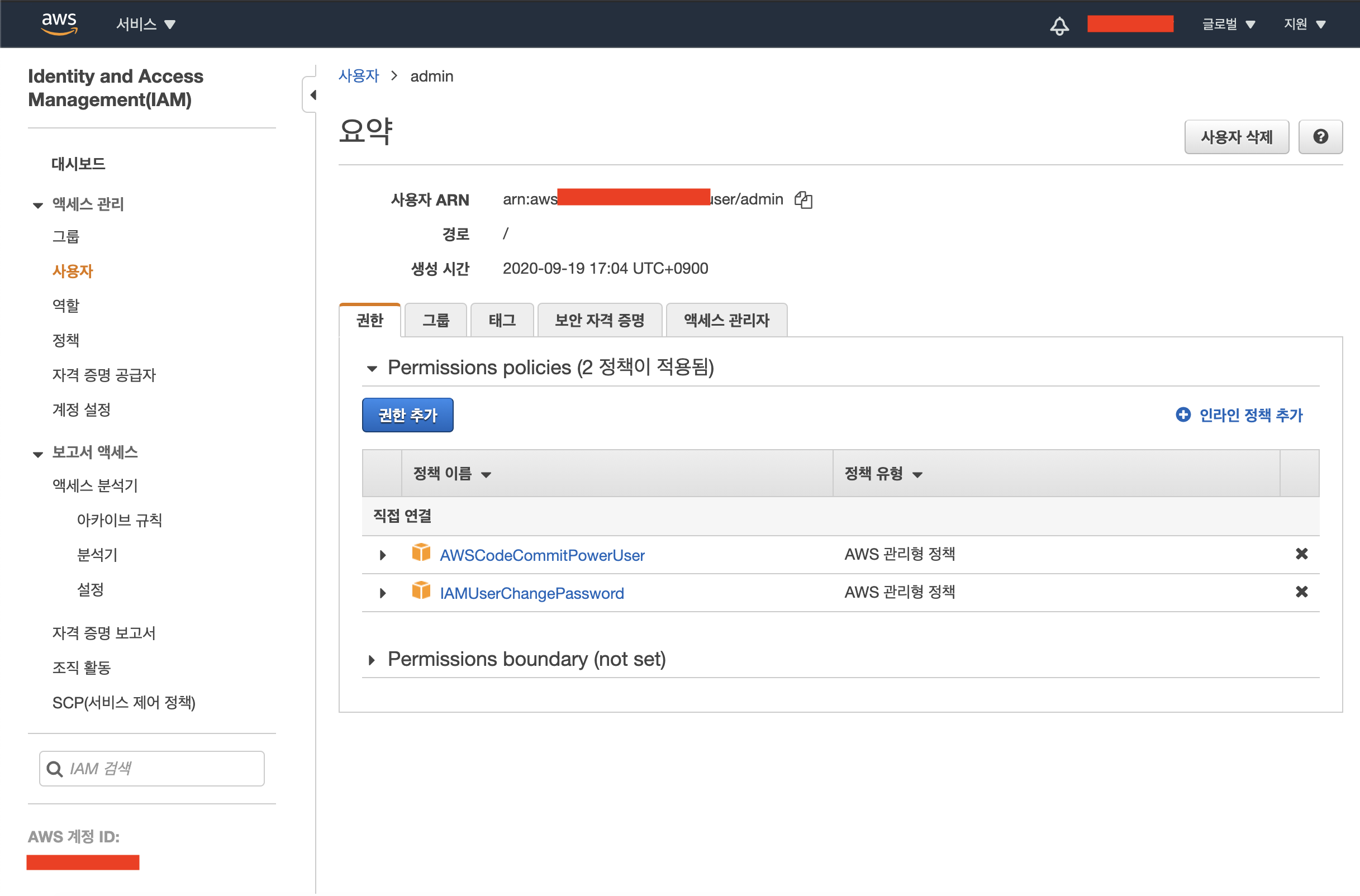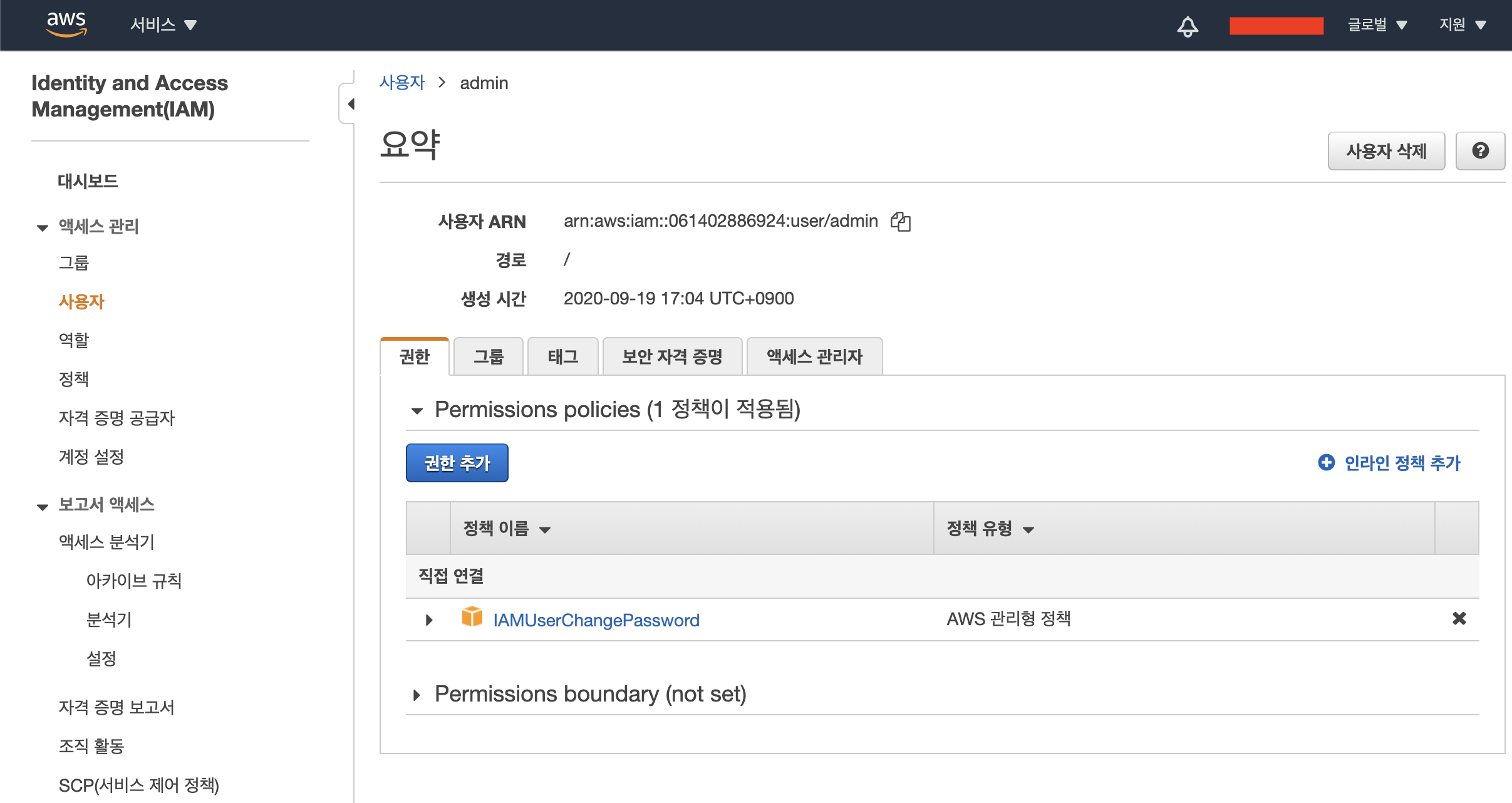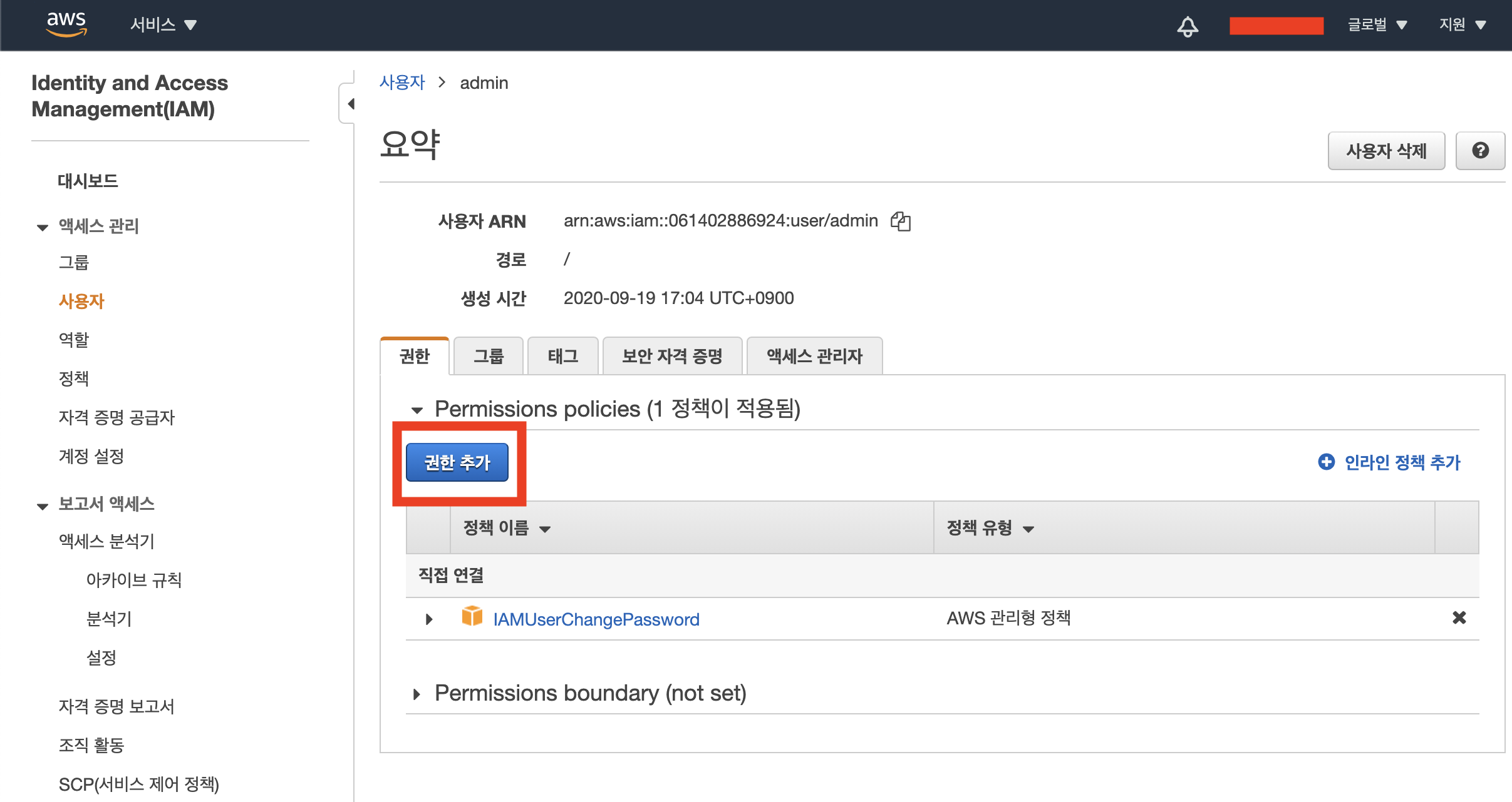 IAM > 사용자 > 생성한 사용자 선택 > 요약 > 권한 > 권한추가 클릭