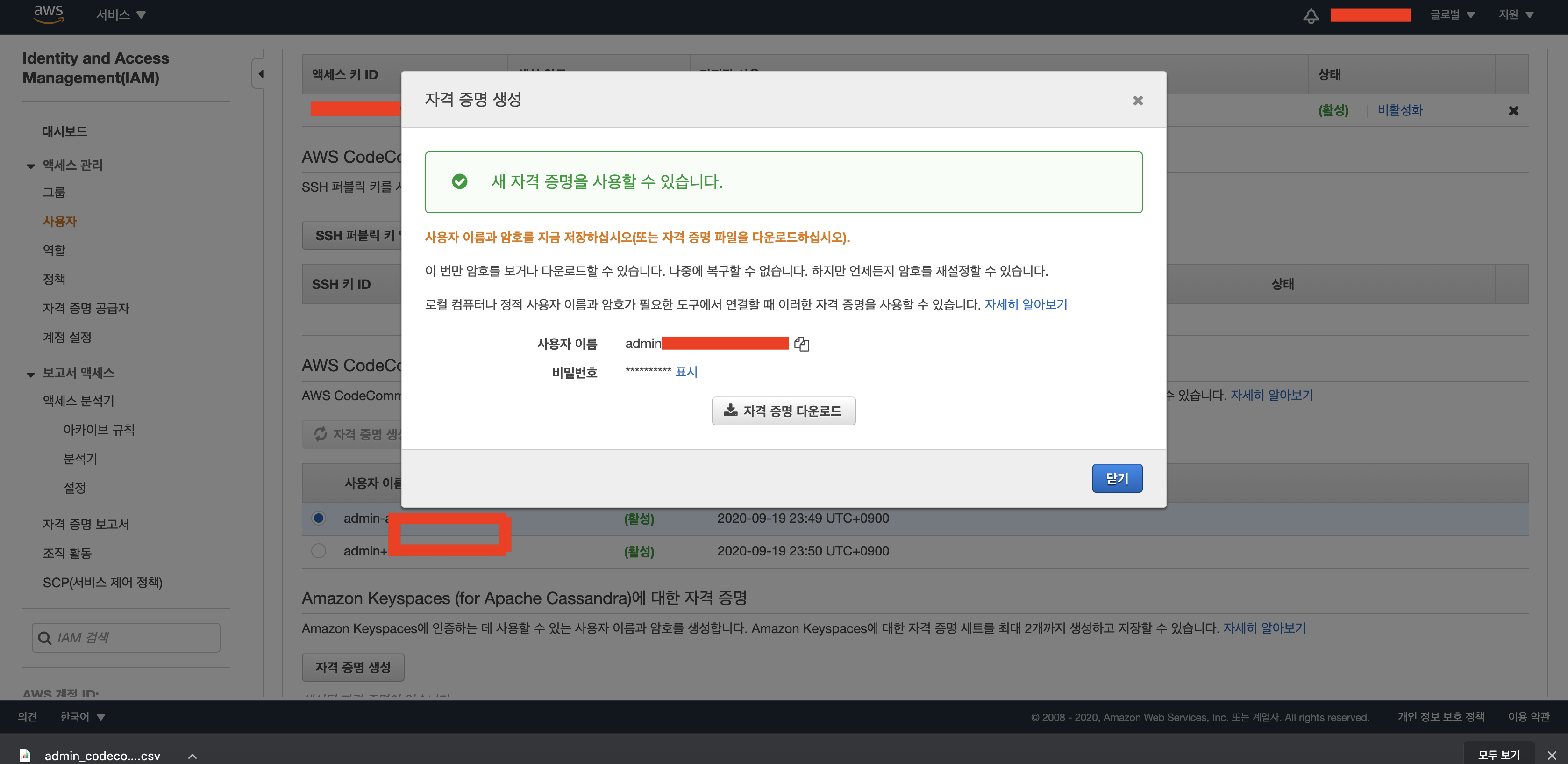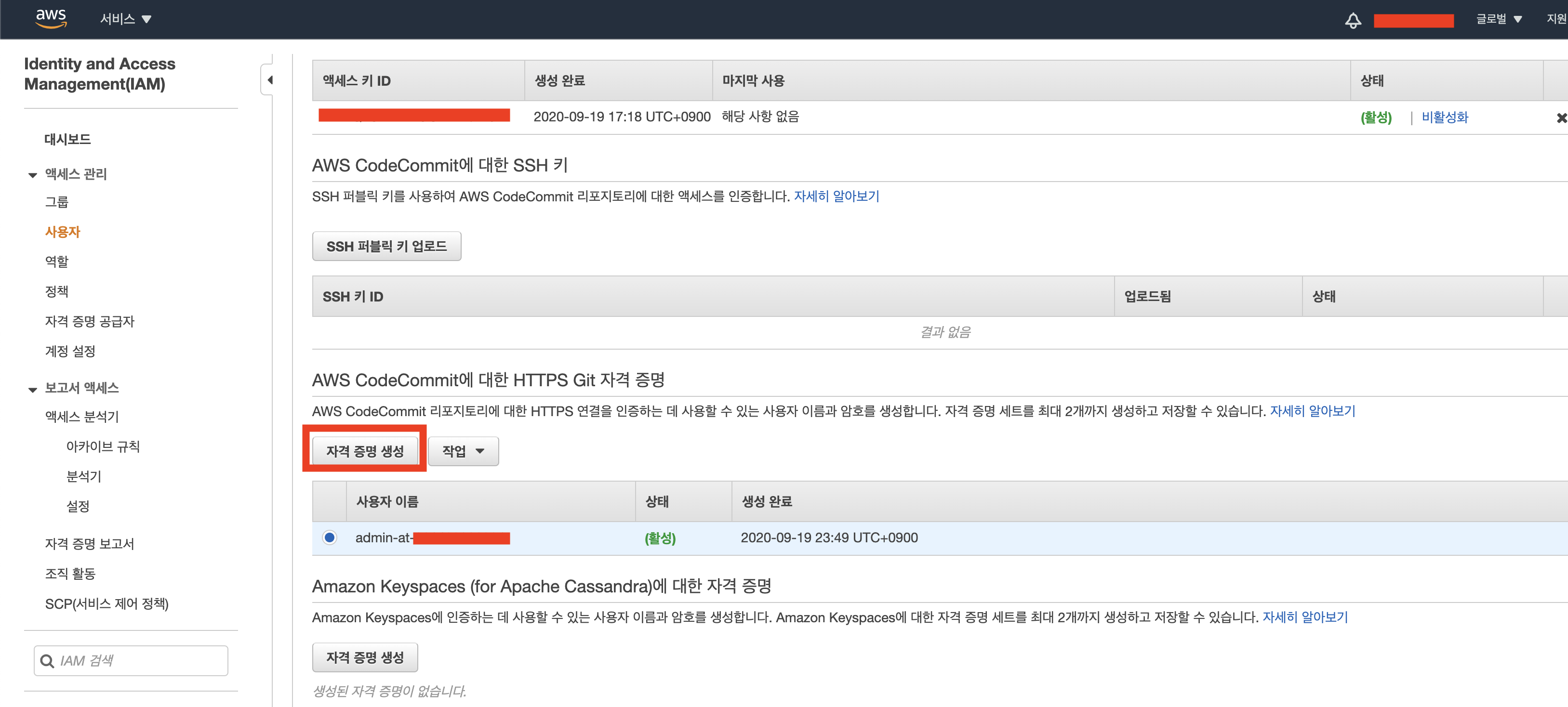 IAM > 엑세스 관리 > 사용자 > 계정 선택 > 요약 > 보안 자격 증명 > AWS CodeCommit에 대한 HTTPS Git 자격증명 > 자격 증명 생성