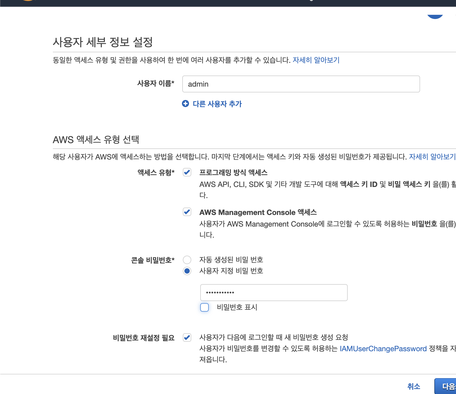 AWS Management Console > 서비스 찾기 IAM 검색 > IAM 엑세스 관리 > 사용자 > 사용자 추가