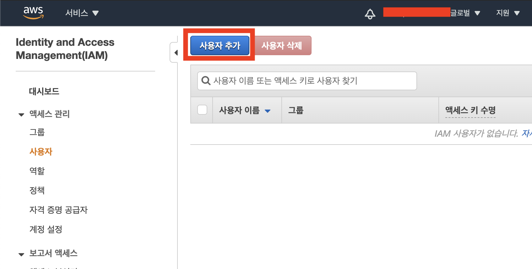 그냥 루트 계정으로 하려니 안되더라고요... 그래서 IAM 사용자 계정을 생성합니다.