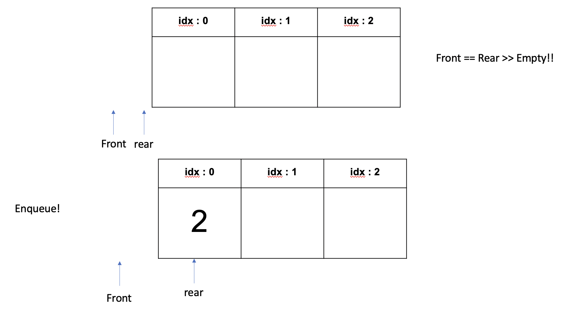 맨 처음 큐가 비었기 때문에 front와 rear 가 idx -1 을 가르킵니다.