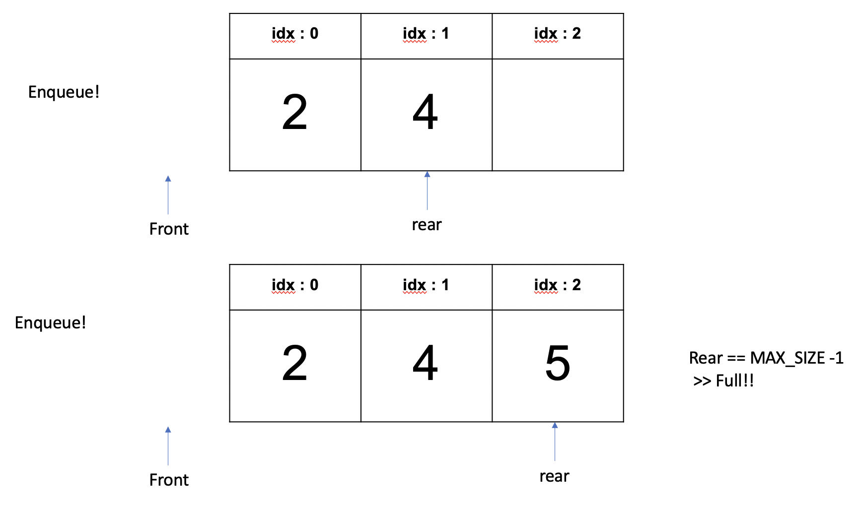 값을 추가했을때 (enqueue) 했을때 rear 값이 하나 증가하여 맨뒤인 idx 0 값을 가리킵니다.